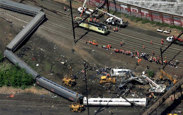 美國鐵路公司(Amtrak)一列火車於2015年5月12日,在費城附近出軌並造成8死、200多傷後,經調查人員初步調查後發現,火車在出軌前可能遭到砲彈襲擊。 (Win McNamee/Getty Images)