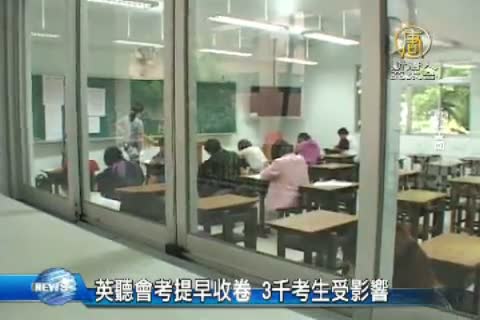 【新唐人亞太台 2015 年 05 月 18 日訊】國中教育會考,昨天爆發近十四年來最嚴重疏失,在英聽測驗部分,全台至少有九考區、三千多位考生被提早三到五分鐘收卷,全國試務會表示,目前擬定的補救方法,是以人工閱卷判斷,只要考生有將答案寫在題本上,就能認定分數。