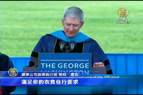 【新唐人亞太台 2015 年 05 月 18 日訊】對質疑的事物勇於表達意見,可能因此就改變我們身處的世界。來看到,蘋果公司首席執行官 庫克,星期天在喬治‧華盛頓大學2015年畢業典禮上演講,他以蘋果創辦人賈伯斯為例,,勉勵即將進入職場的學子懷抱夢想,要往正義、正確方向進行。他說,賈伯斯希望蘋果能改變世界,而這個夢想,已經成真。