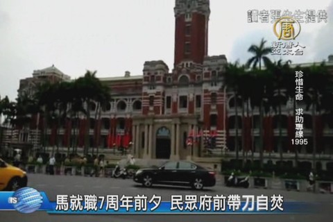 【新唐人亞太台 2015 年 05 月 19 日訊】新聞頭條,先來帶您看到,就在馬總統就職七周年前夕,今天下午驚傳,有民眾在總統府前自焚。 一名年約50歲的男子,在今天下午大約4點43分的時候,手持一把刀與汽油,行經凱達格蘭大道,突然闖過紅燈,正面面對總統府,亮出刀子。憲兵見狀,趨前制止的時候,男子突然往身上點火自燃,全身有80%二度燒燙傷,意識清醒送往台大急救。經過警方初步調查,自焚的陳姓男子住新北市樹林區,因為他的母親和友人有傷害、誣告等官司,曾到總統府前陳情,但法官仍判友人勝,沒想到因此選擇在馬總統7周年前夕,用激烈手段抗議。