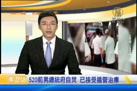 【新唐人亞太台 2015 年 05 月 20 日訊】鏡頭轉回台灣,今天是總統馬英九就職七周年日子,總統馬英九預計將呈現七年施政成效,並搭配民眾現身說法;不過,昨天,有一位男子在總統府前自焚抗議,全身有80%二度燒燙傷,據調查,這名男子的自焚動機是因為官司糾紛,而不是政治訴求,目前這名男子正在醫院,接受插管治療。