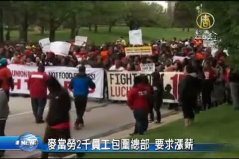 【新唐人亞太台 2015 年 05 月 22 日訊】再來看到,也是罷工消息,美國速食業龍頭麥當勞,雖然之前喊出要為直營店員工加薪,但仍有九成的門市員工,沒有加薪。昨天,近兩千位麥當勞員工,包圍總部股東會議,要求把最低時薪,上調到15美元,相當於台幣450元,目前美國法定最低薪資,約台幣222元,這次抗議,一度癱瘓街道,也有員工被指控非法入侵,遭到逮捕。