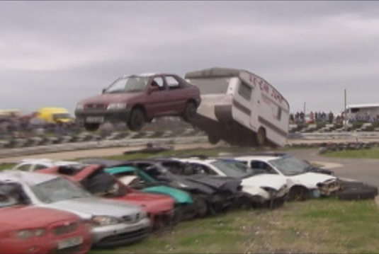 一台、二台、三台,參賽車輛陸陸續續撞毀在車陣當中,這些飛車特技迷試圖擊敗美國飛車特技明星埃維爾•克尼弗(Evel Knievel )的紀錄。(5月4日星期一)這場在英國西薩塞克斯郡安美林鎮(Angmering)舉行的『飛車障礙賽』,與其說是飛車競技挑戰賽,還不如說是一場接受 撞擊的勇氣與運氣挑戰大賽。