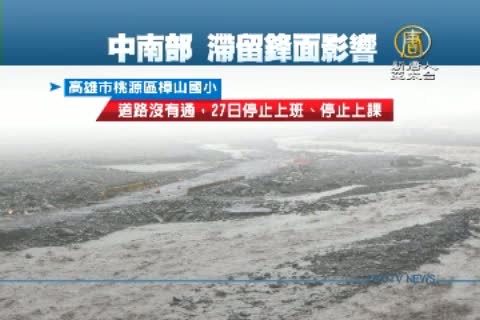 【新唐人亞太台 2015 年 05 月 26 日訊】新聞頭條帶您看到,受到滯留鋒面影響,連日大雨,造成中南部多處交通受到影響。高雄市桃源區樟山國小,因為道路沒有通,27日停止上班、停止上課;南橫公路工程路段泥濘,26日晚上7點到隔日早上七點,採預警性封路;嘉義縣169線下午4點搶通,剩餘台20線,預計最晚6月8日搶通。
