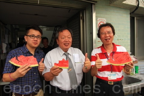 福興鄉公所預計本月30日舉辦西瓜節,鄉長粘禮淞(中)表示,今年的西瓜不僅沒泡水,生長期因為雨量少,甜度更勝以往,算是大豐收。(郭益昌/大紀元)