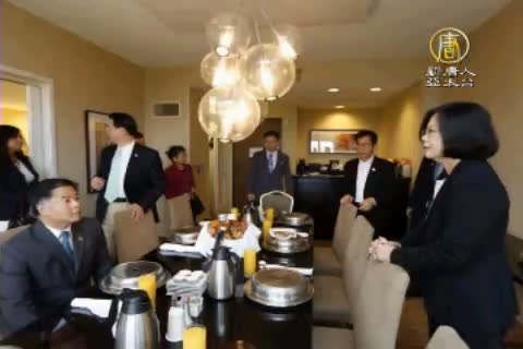 【新唐人亞太台 2015 年 05 月 31 日訊】蔡英文訪美行程滿檔,第一天光在飯店裡,就見了3位眾議員,除了美國史上首位華裔女性眾議員趙美心,還有去年(2014年)才剛當選的,首位台灣出生眾議員劉雲平,兩人相談甚歡,還聊起了林書豪。