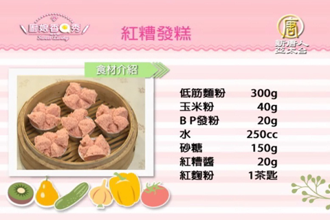 低筋麵粉 300g、玉米粉 40g、B P發粉 20克、水 250cc、砂糖 150g、紅糟醬 20g、紅麴粉 1茶匙。