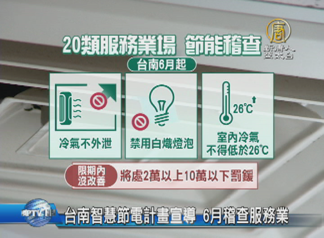 台灣有95%的能源供給仰賴進口,為了更有效率的使用電力,經濟部提出「智慧節電計畫」,台南市配合中央,6月起,將針對20類服務業場所展開節能稽查, 包括「冷氣不外泄」、「禁用白熾燈泡」及「室內冷氣不得低於攝氏26度」等,限期內如果沒有改善,最高將處新台幣10萬元罰鍰。