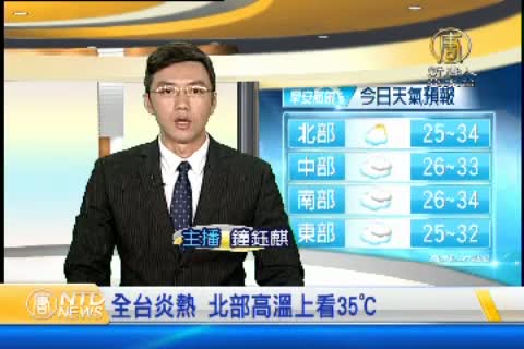【新唐人亞太台 2015 年 06 月 02 日訊】歡迎您收看6月2日的早安新唐人,我是鐘鈺麒。先來帶您關心今天的天氣情況。因為鋒面遠離,加上西南風影響,今天全台各地,高溫炎熱西半部高溫約達攝氏32到34度,東半部高溫也有31到32度。未來幾天,西半部地區氣溫會明顯飆升,感覺會更悶熱,提醒觀眾朋友,記得適時補充水分,並且做好防曬措施。帶您一起來看到國際媒體重要訊息。