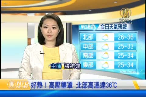 【新唐人亞太台 2015 年 06 月 03 日訊】歡迎您收看6月3日的早安新唐人,我是張祺翎。先來帶您關心今天的天氣情況。今天高壓勢力籠罩台灣,全台都是晴到多雲的炎熱天氣,山區及東北部午後有零星陣雨,北部高溫可達33到36℃,中南部約32到34℃,東南部地區還有焚風發生機會。提醒大家,今天白天各地紫外線指數容易達到過量到危險等級,盡量減少在中午前後出門,並做好防曬工作和多補充水分。帶您一起來看到國際媒體重要訊息。