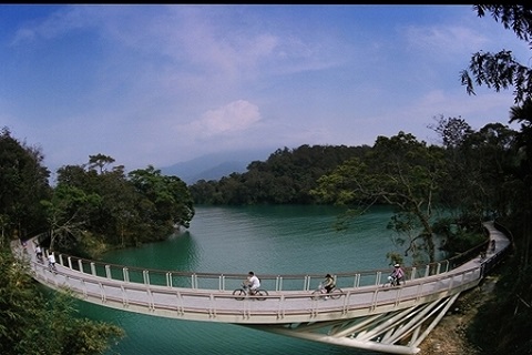 中華民國交通部推自行車旅遊,圖為騎自行車沿著日月潭湖畔的環湖公路,山水風光盡收眼底,一路上更可飽覽名勝古蹟。(日月潭風管處提供)