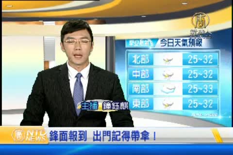 【新唐人亞太台 2015 年 06 月 04 日訊】歡迎您收看6月4日的早安新唐人,我是鐘鈺麒。先來帶您關心今天的天氣情況。受到鋒面雲雨帶影響,今天中部以北和東北部地區,會有短暫陣雨或雷雨,提醒您出門記得帶傘。氣溫部份,北部因為降雨的關係,高溫大概會降到31到32℃,但感受上還是比較悶熱,中南部則是在32到33度,預計這波鋒面,會持續影響到星期六。帶您一起來看到國際媒體重要訊息。