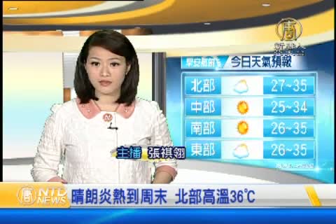 【新唐人亞太台 2015 年 06 月 09 日訊】歡迎您收看6月9日的早安新唐人,我是張祺翎。先來帶您關心今天的天氣情況。受到太平洋高壓勢力影響,今天全台都是晴到多雲的穩定天氣,山區和東北部局部地區午後有短暫陣雨的機會。氣溫部分,今天全台各地氣溫炎熱,北部高溫可達35到36℃。提醒大家,未來幾天紫外線指數容易達到「過量」到「危險」等級,戶外活動盡量避免陽光長時間曝曬以免曬傷。帶您一起來看到國際媒體重要訊息。