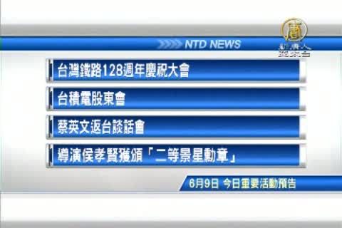【新唐人亞太台 2015 年 06 月 09 日訊】接著看到,今天,六月9日 ,星期二,有哪些重要活動,台灣鐵路128週年慶祝大會。財經方面,台積電股東會,發布第二季營收展望。另外,民進黨主席蔡英文晚間抵台,將在機場發表談話,以及,拿下本屆坎城影展最佳導演的侯孝賢,獲頒「二等景星勳章」。