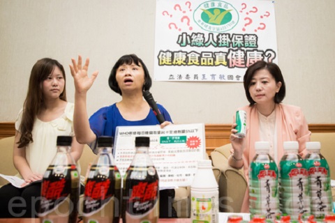 國民黨立委王育敏(右1)9日表示,我國健康食品過於浮濫,產品本身添加物多,含糖量高,只要有保健功效,就能取得健康食品標章,容易誤導消費者。(陳柏州/大紀元)