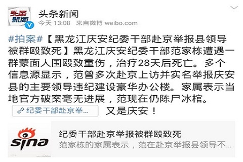 6月9日,大陸財經網報導,黑龍江省慶安縣紀委官員范家棟赴京舉報慶安縣主要官員,不久即被人群毆致重傷,在醫院治療28天後,於5月1日凌晨死亡(與慶安警察槍殺訪民徐純合僅相差一天),范家棟的家屬表示,當地官方破案毫無進展,范現在仍陳屍冰棺。