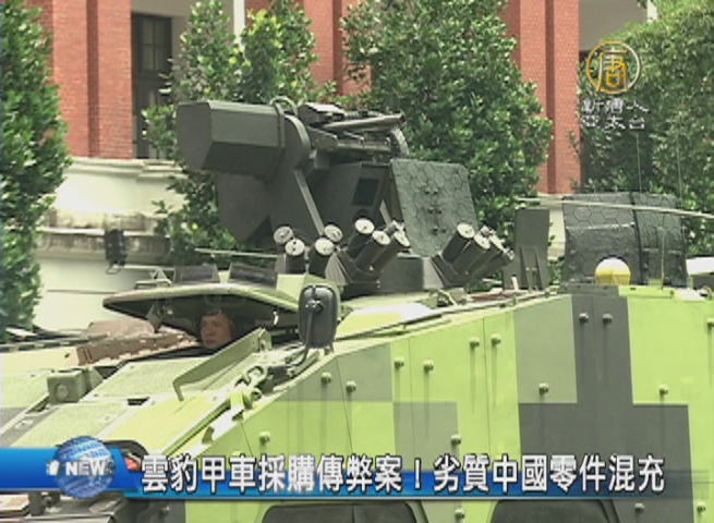 【新唐人亞太台 2015 年 06 月 11 日訊】國軍再傳採購弊案!台灣自製的雲豹甲車,委由民間量產,卻驚傳動力底盤系統採購案,被中興電工等軍火商集團低價搶標,再用劣質的中國零件混充,並買通驗收的現職軍人,導致雲豹甲車故障頻頻。臺中地檢署今天(11日)動員搜索軍備局209廠、國防部採購室與嫌疑人住處、辦公室,並約談中興電工負責人等60多人,釐清這樁採購弊案。