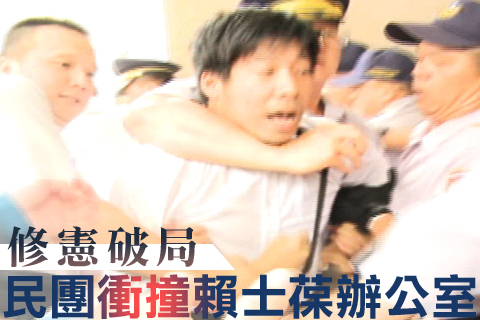民間團體突襲國民黨政策會執行長賴士葆辦公室,與警方激烈拉扯,社運人士王奕凱被控襲警,遭警方壓制雙手綑綁束帶,送警局偵辦。而多名闖入走廊席地而坐的成員,也通通被警方強制驅離。