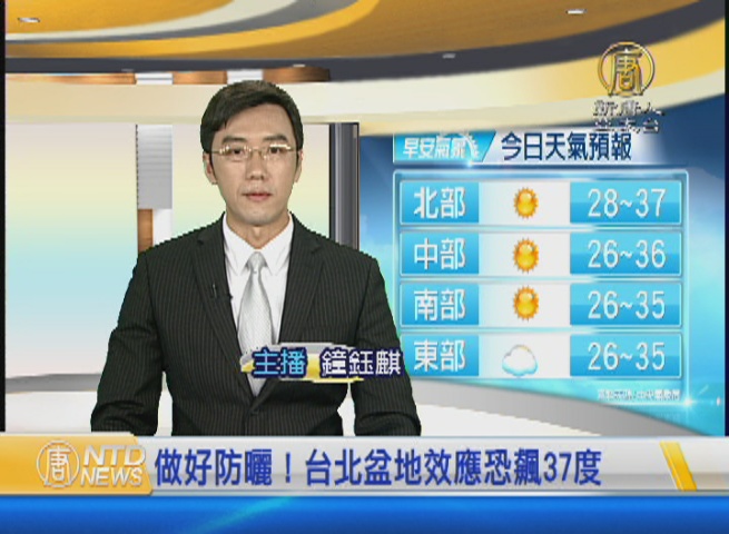 【新唐人亞太台 2015 年 06 月 18 日訊】歡迎您收看6月18日的早安新唐人,我是鐘鈺麒。先來帶您關心今天的天氣情況。今天與昨天一樣,除了留心午後雷陣雨,今天全台仍會維持悶熱高溫的天氣。在氣溫方面,各地高溫仍維持33到36度間,而且大台北地區,因為盆地效應和西南風增強,高溫可能來到37度。今天紫外線指數也容易達「危險級」,提醒您上午10點到下午3點,最好減少在戶外曝曬的機會。帶您一起來看到國際媒體重要訊息。