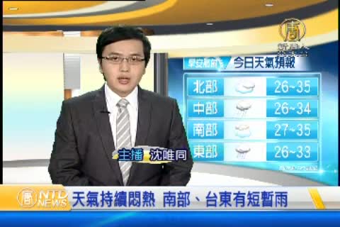 【新唐人亞太台 2015 年 06 月 22 日訊】歡迎您收看6月22日的早安新唐人,我是沈唯同。先來帶您關心今天的天氣情況。結束端午連續假期,這幾天大家是不是都有出去走走呢?今天起恢復正常上班上課,天氣的方面,受到鋒面逐漸北移的影響,北部、東半部為多雲到晴、午後山區有局部短暫雷陣雨,而南部及東南部地區受到受到南方水汽北移影響,為多雲短暫陣雨的天氣。氣溫方面,北部、東半部約26到33℃,中南部為27到34℃,局部地區高溫仍可達35℃,外出仍須留意防曬防中暑。帶您一起來看到國際媒體重要訊息。