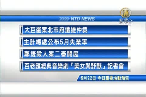 【新唐人亞太台 2015 年 06 月 22 日訊】接著看到,今天,6月22日,星期一,有哪些重要活動,首先是大巨蛋案是否違約,台灣營建仲裁協會上午召開工期展延仲裁庭;主計總處公布5月失業率;鄭捷殺人案二審開庭;以及藝文消息,百老匯經典音樂劇「美女與野獸」記者會。