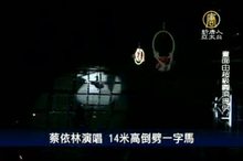 2010-12-26 20:05:21蔡依林演唱會,昨天晚上進入第二場,小天后再秀絕技!在安可曲時,蔡依林在14公尺高的鋼環上,演出一字馬和人形拱門,場面相當驚險,也讓全場歌迷尖叫聲連連。