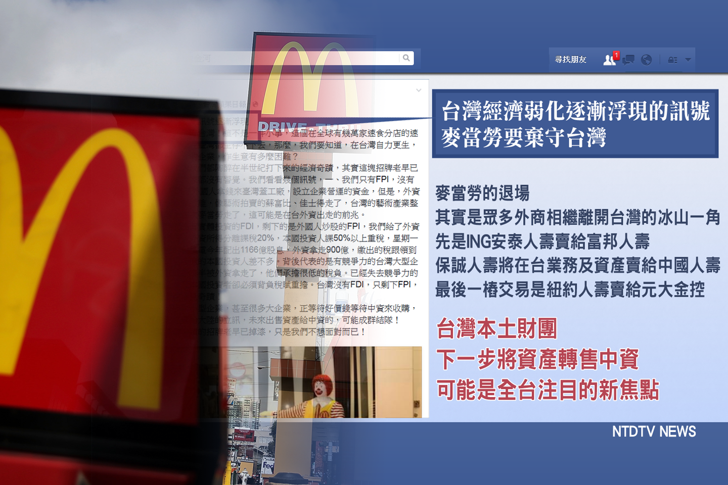【新唐人亞太台 2015 年 06 月 27 日訊】針對速食連鎖業龍頭麥當勞,在台灣投下震撼彈,子公司將撤出台灣,尋求授權發展夥伴,財信傳媒集團董事長謝金河在臉書上發文表示:麥當勞要棄守台灣,其實是台灣經濟弱化逐漸浮現的訊號。謝金河指出,麥當勞的退場,其實是眾多外商相繼離開台灣的冰山一角。先是ING安泰人壽賣給富邦人壽、保誠人壽將在台業務及資產賣給中國人壽,最後一樁交易是紐約人壽賣給元大金控。謝金河也強調,台灣本土財團下一步將資產轉售中資,可能是全台注目的新焦點。