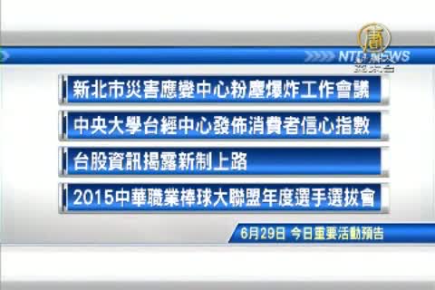 【新唐人亞太台 2015 年 06 月 29 日訊】接著看到,今天,6月29,星期一,有哪些重要活動,首先,一大早,新北市長朱立倫,主持災害應變中心的粉塵爆炸工作會議,並將對外度公布調查進度。財經消息,中央大學台經中心發佈6月份消費者信心指數。另外,台股資訊揭露新制 在今天上路。體育消息方面,今天有一場職棒大聯盟年度選手選拔會。