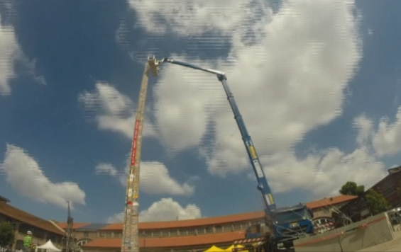 各個團隊將各自負責的部分蓋完後,工作人員再將這一組組十字形的積木塔搬到太陽下,按照大小一層層疊起,最後還出動雲梯車才將積木塔順利完成。