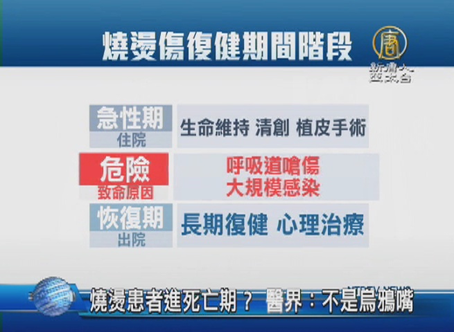以燒燙傷病人復健情況,做簡易區分,病患分為住院的急性期,以及出院後,伴隨長期復健的恢復期,急性期間,早期的呼吸道嗆傷,以及燒燙傷面積大於40%,所誘發的大規模感染,都可能成致命原因,醫界人士認為,百日之內都需密切觀察。