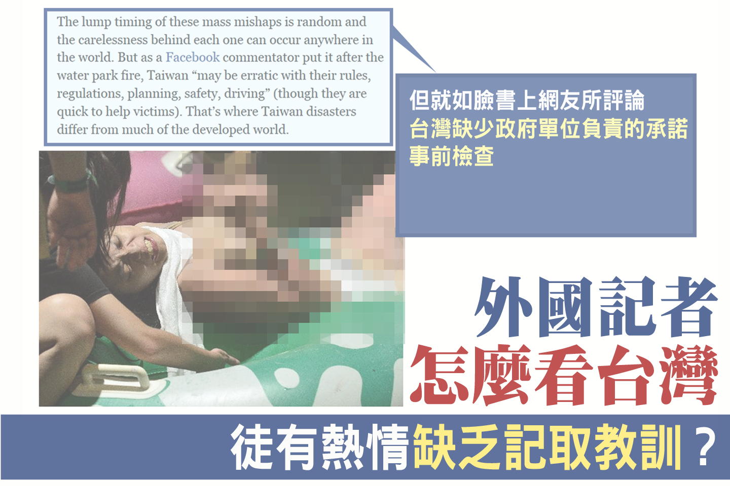 幾天前八仙樂園的粉塵爆炸意外,去年7月的高雄氣爆,以及今年和去年兩起空難,最近台灣發生的一連串公安意外,每個都引發外媒關注。