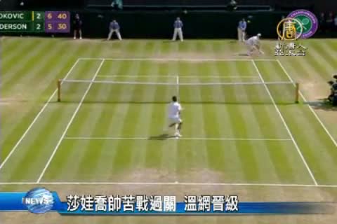 【新唐人亞太台 2015 年 07 月 08 日訊】來關心溫網最新賽況。俄羅斯女將莎拉波娃拼戰3盤,力克美國對手范德維奇,順利晉級溫布頓錦標賽4強,可能遭遇小威廉絲。而前一天苦戰4盤超過3小時,卻打到2:2平手延賽的世界球王喬科維奇,昨天與南非好手安德森進行決勝盤,打得也不輕鬆,在對手全場打出40記 Ace的情況下,喬科維奇把握機會破發,以7:5,驚險晉級8強。