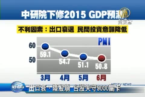 多重利空壓境,台股湧現賣壓,不過最讓人擔心的,還是實體經濟層面。中研院表示,受到中國、新興市場出口衰退,民間投資意願降低,PMI指數呈現劇烈下滑趨勢,從三月的59.1,下滑至6月的50.8。預估今年實質經濟成長率,將從去年底預測的3.38%,大幅下修至3.09%。