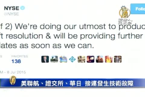 【新唐人亞太台 2015 年 07 月 09 日訊】美國聯合航空、紐約證券交易所和《華爾街日報》,當地時間周三分別出現電腦、技術故障,迫使紐約證券交易所場內交易停頓三個半小時,聯合航空 所有在美國境內航班一度停飛。不過,美國國土安全部研判,應該不是駭客或恐怖攻擊。