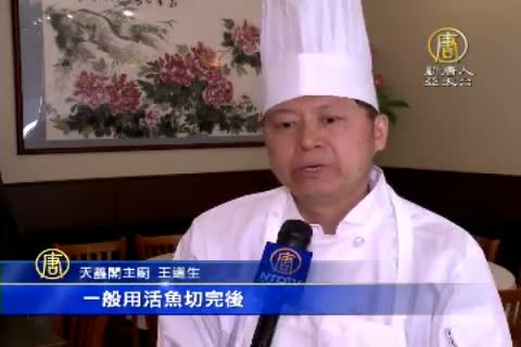 新唐人電視臺廚技大賽銀獎 天鑫閣主廚 王道生:「用活魚切完後,用水沖,把魚腥味沖掉,然後上漿很重要,要不然它不夠滑。」