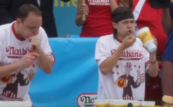 【新唐人亞太台 2015 年 07 月 12 日訊】美國國慶日,不能錯過活還有「吃熱狗大賽」!今年23歲的亞裔小子,在10分鐘內吃了62條的熱狗及麵包,打敗蟬聯8屆的冠軍選手喬伊,成為新的熱狗大胃王。