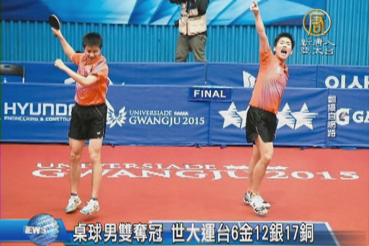 【新唐人亞太台 2015 年 07 月 13 日訊】來看到世大運中華隊再傳捷報,桌球黃金搭檔,江宏傑、黃聖盛,昨天,面對日本選手,在先輸1盤的情況下,連趕4盤,最後以4比1,成功在男雙奪金,目前中華隊在世大運的成績是,6金12銀17銅。
