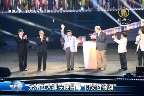 【新唐人亞太台 2015 年 07 月 14 日訊】2015年光州世界大學運動會今晚閉幕,中華代表團 本屆世大運共拿下6金12銀18銅。而下一屆,2017年的世大運 將由台北市主辦,台北市長柯文哲今晚出席光州世大運閉幕式,穿上新西裝亮相,從世界大學運動總會長 賈里恩 手中,接過會旗,接著進行約3分鐘的全英文演講,最後由台灣的演出團體上台表演,向世界展現 台北的特色與文化。明天柯文哲將前往首爾,進行接下來的市政參訪行程。