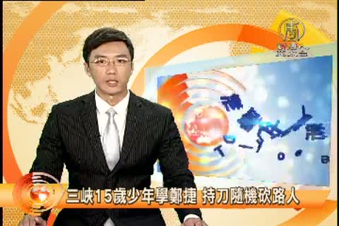 【新唐人亞太台 2015 年 07 月 21 日訊】在昨天北捷傷人案發生後大約1個小時,新北市三峽區也發生隨機砍人事件,砍人的,還是一名年僅15歲的國中生,在台北大學附近,拿菜刀隨機朝路人揮砍,口中還唸著「要學鄭捷殺人」,結果有一男一女被砍傷,送醫後無生命危險。警方逮捕這名少年,他供稱因為從小爸媽不在身邊,與同住的姑姑昨天 發生爭吵後心情差,又沒地方去,於是拿了菜刀就出門,意圖傷人換取作牢 圖個清靜。