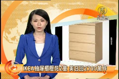 【新唐人亞太台 2015 年 07 月 23 日訊】瑞典家具製造商IKEA的一款抽屜櫃,去年發生 因為沒有固定好而倒塌,壓死2名幼童的案例,兩起案例 都發生在美國。美國IKEA公司宣布,將召回2700萬件 抽屜櫃和梳妝台,並免費提供,可以讓櫥櫃固定在牆上的物件。美國消費者產品安全委員會也建議,使用高於60公分以上的兒童抽屜櫃或75公分以上的成人抽屜櫃時,必須將櫃子固定在牆壁,以免不幸發生倒塌壓傷兒童的事件。