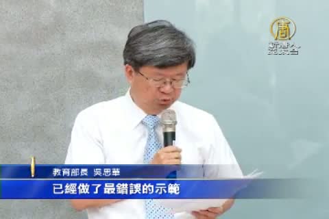 【新唐人亞太台 2015 年 07 月 24 日訊】反課綱學生23日晚間闖入教育部,共33名學生以及民眾遭警方逮捕,教育部長24日上午召開記者會表示,針對學生違法脫序的行為,依法提起告訴。