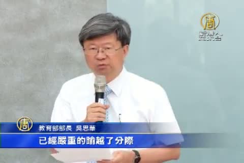 【新唐人亞太台 2015 年 07 月 24 日訊】反課綱學生23日晚間闖入教育部,共33名學生以及民眾遭警方逮捕,教育部長吳思華表示,針對學生違法脫序的行為,要依法提起告訴,另外,國教署長去留,也受到關注。