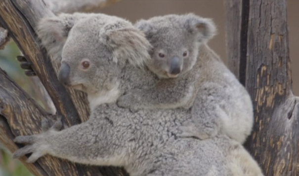 美國聖地牙哥野生動物園(San Diego Zoo Safari Park)的澳洲內陸園區飼養著袋鼠和一些澳洲的鳥類,無尾熊是區內的明星動物。一隻9個月大的小無尾熊,可愛的模樣更是吸引遊客的目光。這毛茸茸的小淘 氣尚未命名,雖然已離開媽媽的育兒袋8個星期,依舊難掩對母親的依賴,經常趴在媽媽的背上。