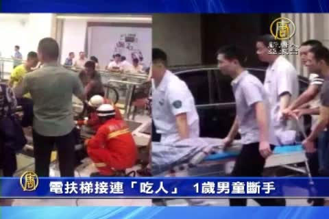 【新唐人亞太台 2015 年 07 月 28 日訊】中國湖北省荊州電扶梯殺人事件後,週一廣西省梧州又發生電扶梯傷人意外。一名1歲多的小男孩被捲入電扶梯,左邊手掌到手臂中段全被絞斷。而在前一天的事故中,一對母子在荊州商場因電扶梯踏板突然鬆脫掉進機械間。母親在最後一刻舉起兒子,自己不幸遭機械捲入,3個多小時被救出後已不治身亡。當時有2名營業員一直站在手扶梯口,外界認為商場肯定知道手扶梯出現問題。微博更盛傳現場消息遭封鎖,完全沒有媒體到現場採訪,直到傍晚才有簡短報導。