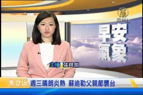 【新唐人亞太台 2015 年 08 月 05 日訊】歡迎您收看8月5日的早安新唐人,我是張祺翎。先來帶您關心今天的天氣情況。今年第13號颱風蘇迪勒,已經增強成為強烈颱風,而且依照氣象局預報顯示,蘇迪勒直撲台灣的機會很高,全台都會受到影響。預估週五週六將會是颱風影響台灣最劇烈的時候。提醒您安排父親節活動時要特別注意。而受太平洋高壓壟罩的影響,今天台灣各地仍然是晴朗炎熱的天氣,高溫上探33-35度帶您一起來看到國際媒體重要訊息。