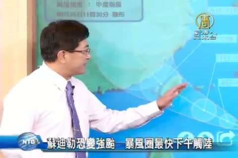【新唐人亞太台 2015 年 08 月 07 日訊】中度颱風蘇迪勒朝台灣逼近,氣象局持續發布海上陸上颱風警報。從今天下半天開始, 暴風圈就會觸及台灣東部陸地,今晚蘇迪勒暴風圈將籠罩全台灣。