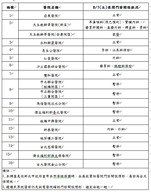 因應蘇迪勒颱風來襲,為加強鄉親服務,新北市政府衛生局調查本市16家急救責任醫院門診開診情形如下表供民眾參考,歡迎有需要的民眾,可多加利用。
