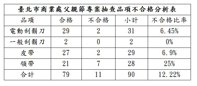 臺北市商業處父親節專案抽查品項不合格分析表。