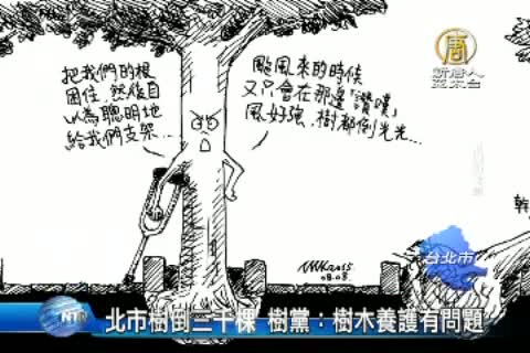 【新唐人亞太台 2015 年 08 月 09 日訊】蘇迪勒颱風來襲,北市初估3073件樹木出現斷枝、全倒或傾斜情況,災情慘重,但除了風勢強勁之外,長期關注樹木保育的樹黨就指出,行道樹,沒有受到妥善的照護也是主因,像是植穴過小,或是充滿水泥塊,還有樹身上過度修剪等問題。