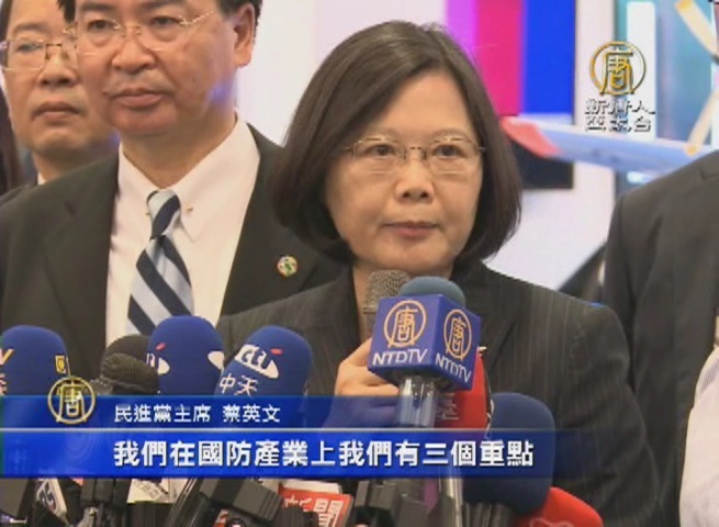 【新唐人亞太台 2015 年 08 月 13 日訊】民進黨主席蔡英文今天(13日)前往國防展參觀,並發表國防產業政見,宣示如果民進黨重返執政,將會推動軍民共享研發技術,並將國防產業重點放在航太、船艦與資安,三項重點。